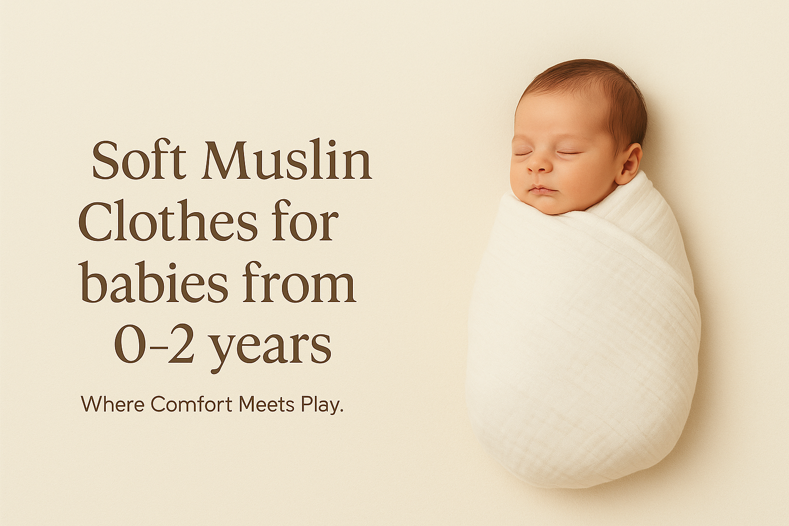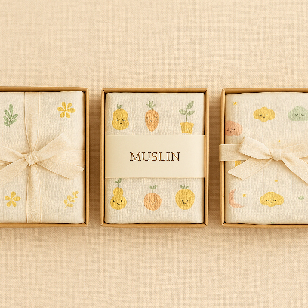 Each piece is crafted from 100% cotton muslin — gentle, breathable, and kind to newborn skin.
