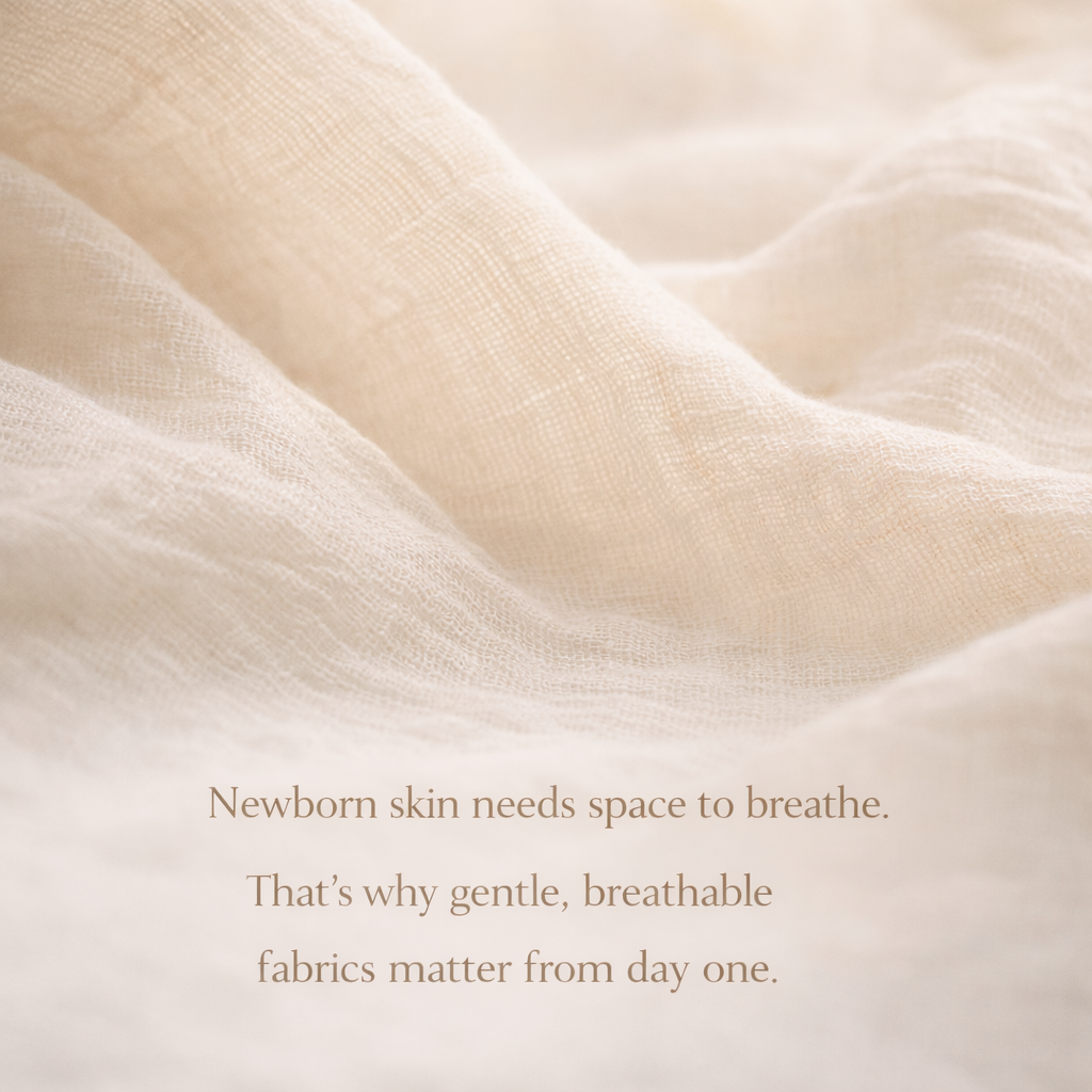 Most baby clothes use synthetic fabrics or chemically-treated cotton that can irritate newborn skin. Many hospitals still use rough towels with harsh dyes.